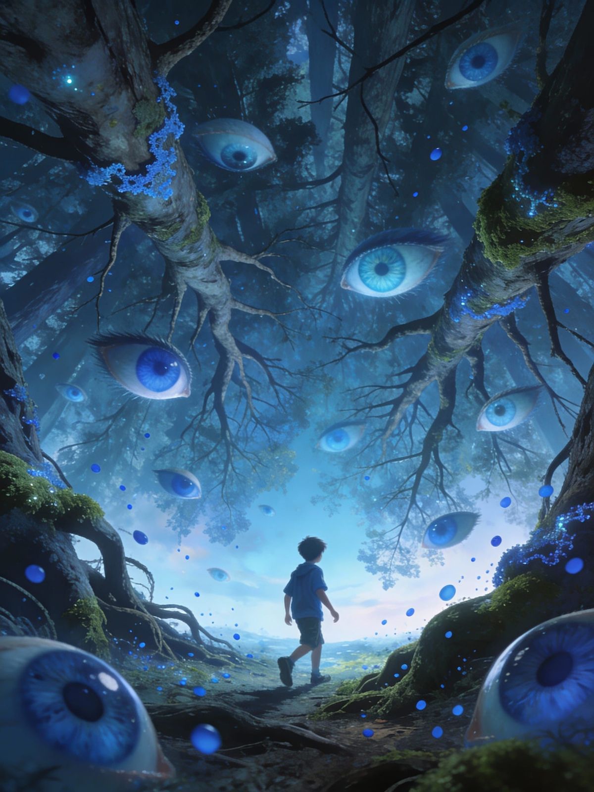 This image shows a boy in a surreal, upside-down forest with watchful floating eyes. The scene is highly detailed and dreamlike, dominated by a blue color palette.
