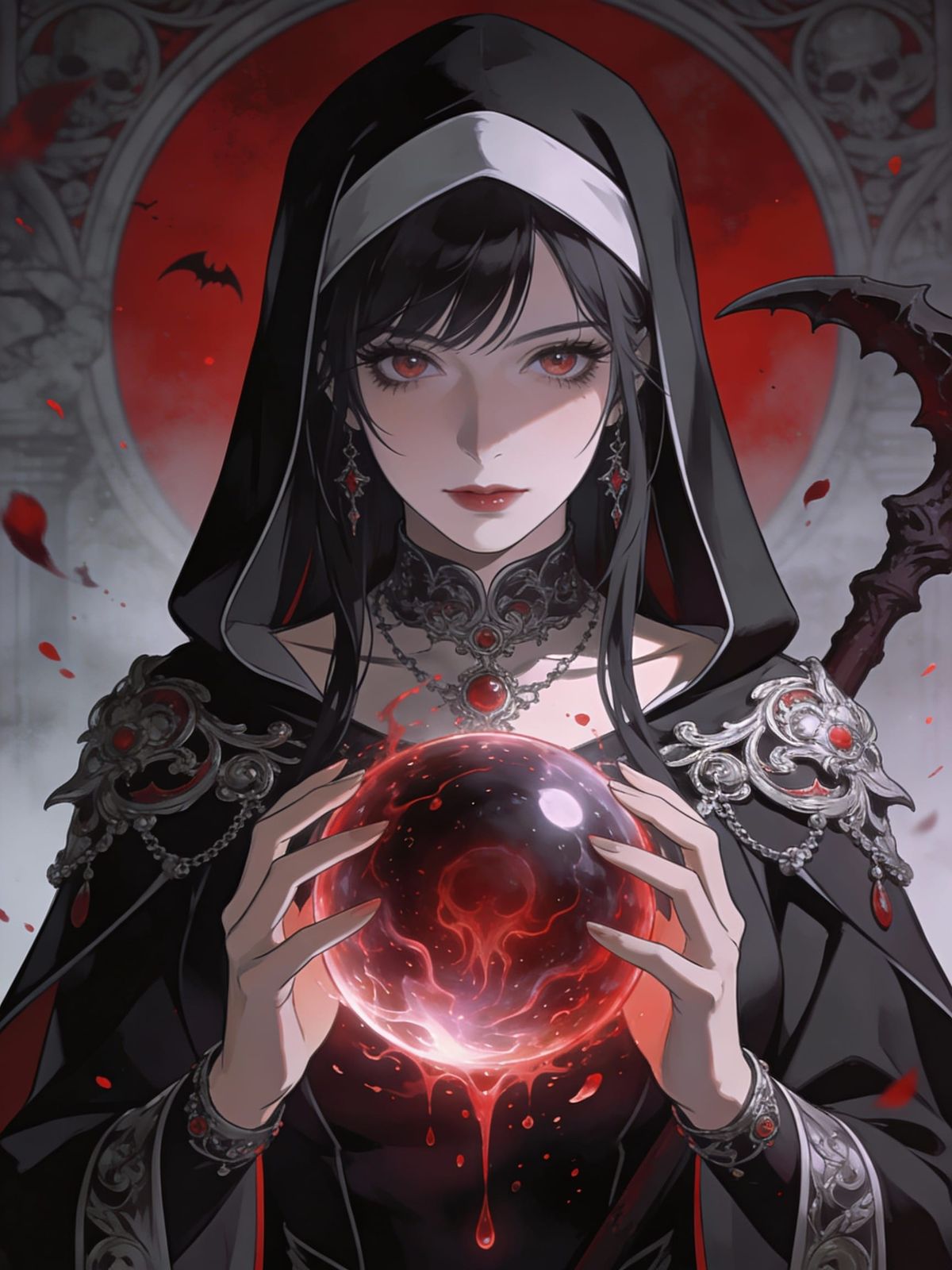 This anime concept art features a woman as the Grim Reaper, holding a spectral orb. The portrait is highly detailed with dynamic lighting and triadic colors, rendered in a realistic shaded style.