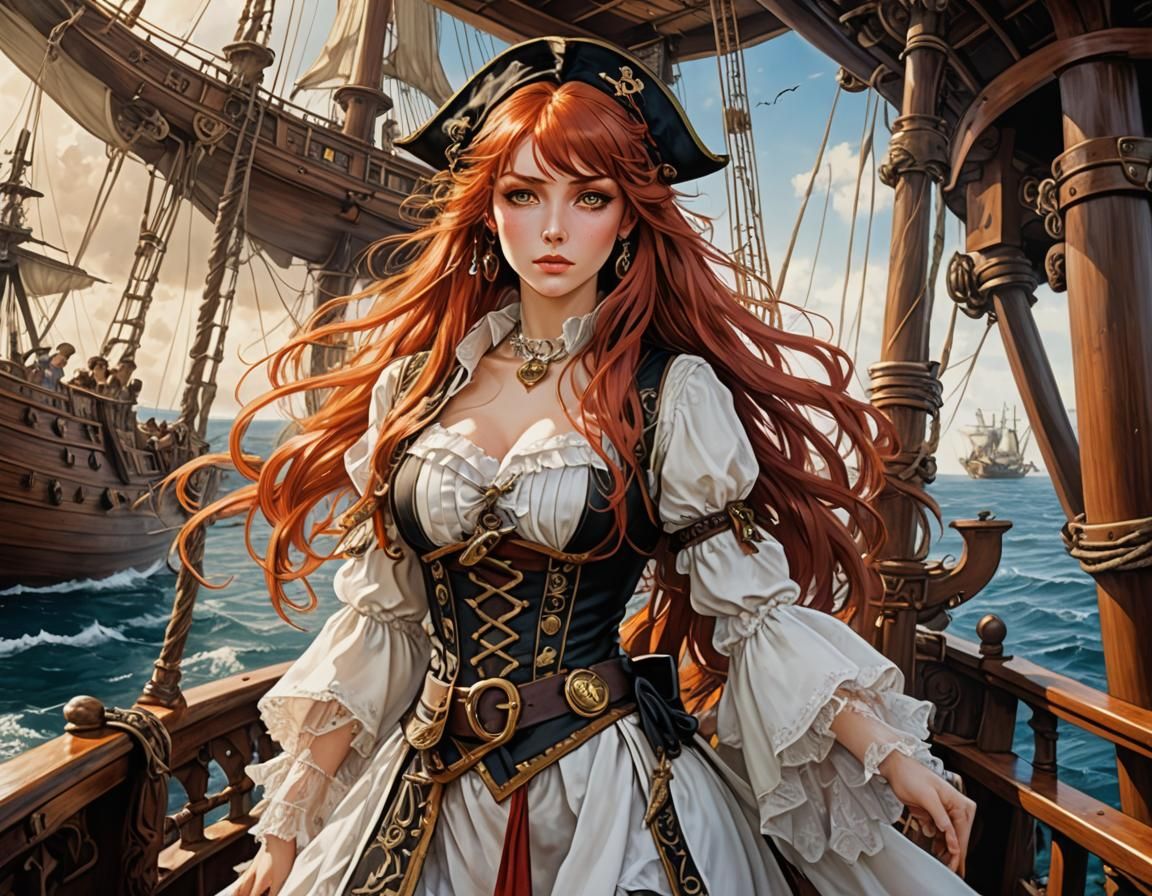 masterpiece, best quality, animated illustration of a beautiful redheaded pirate girl with clear eyes, art nouveau style, vibrant, (in the style of anime chobits), on the deck of a pirate ship, sharp focus, maximalism, natural lighting, art by Luis Royo, high saturation, bold image , cinematic conceptual art,