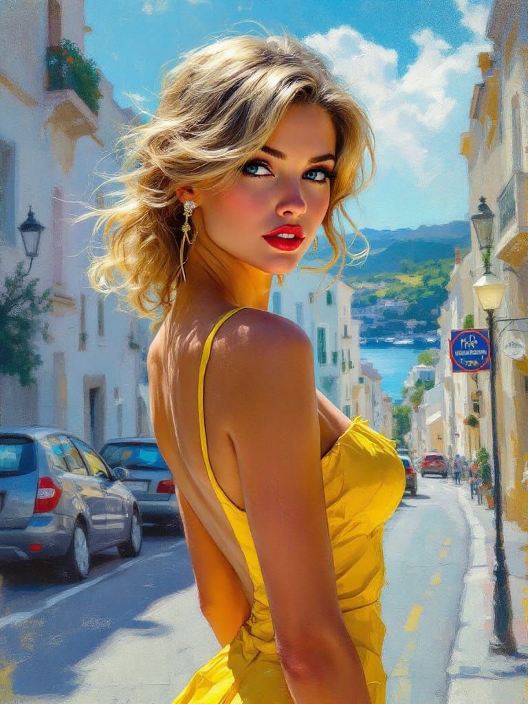 This image showcases a classic pin-up figure in a yellow sundress on a Paris street, rendered in encaustic wax with impressionistic light and photorealistic urban detail.