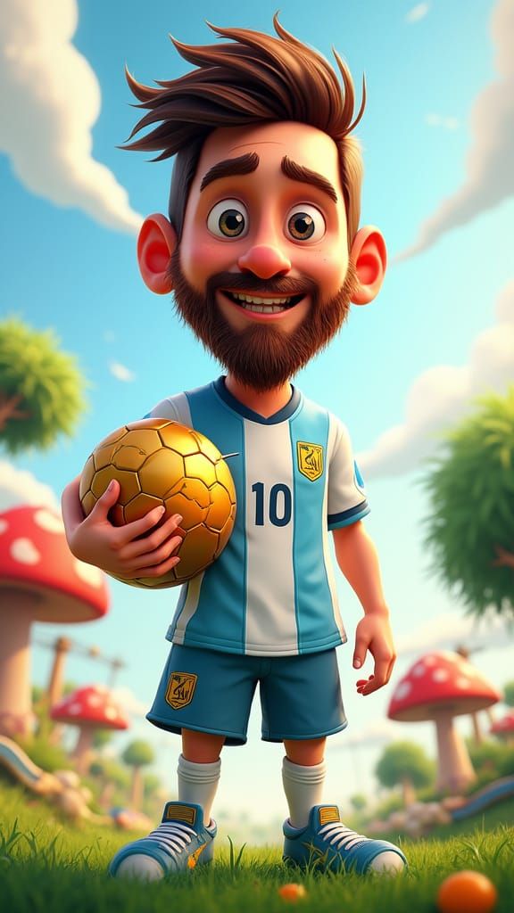 This image shows a stylized Lionel Messi, inspired by vibrant colors and playful animation, with a big head, expressive eyes, and a golden soccer ball, set against a whimsical Mario World backdrop.