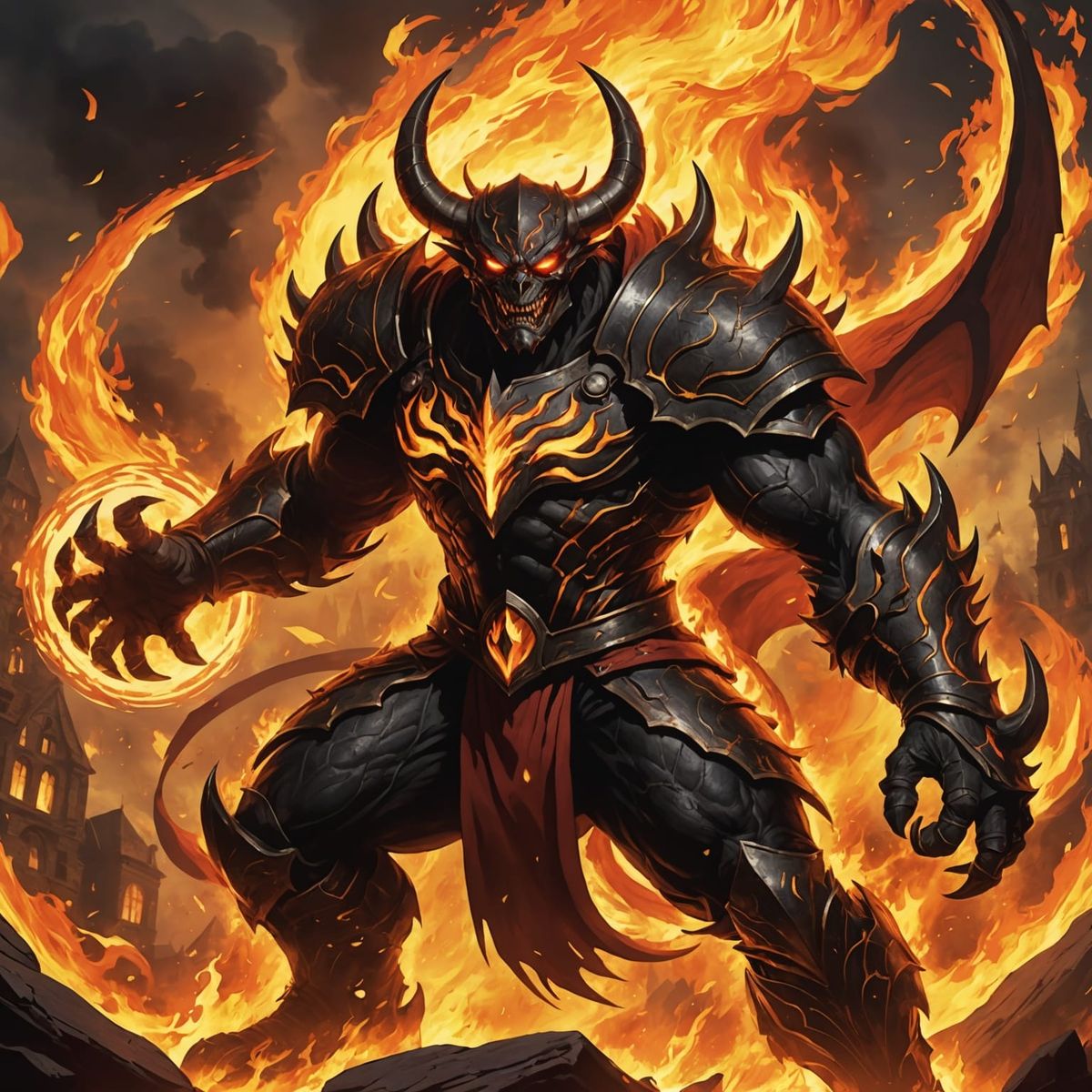 This image depicts a scene of a demon bending fire and destroying heroes. The artwork conveys a sense of fantasy and imaginative power.