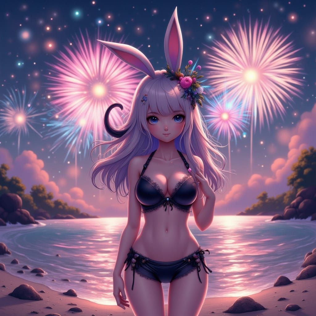 This 3D anime style image features an adorable gothic bunny girl in a bikini celebrating New Year's Eve with fireworks over the sea, holding a large carrot. Hyperrealistic details and vibrant colors.