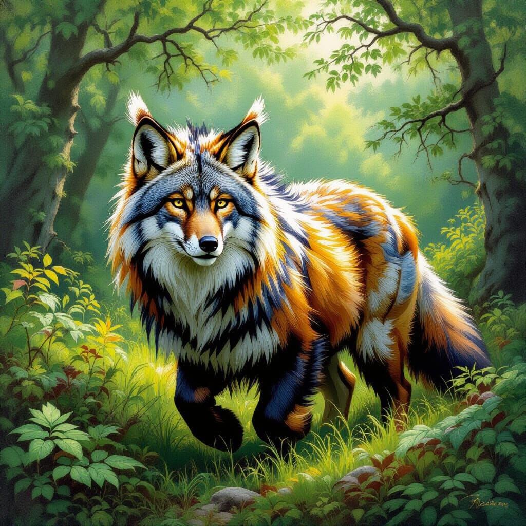 This image shows a vibrant, majestic animal in a lush forest. The artwork features intricate details and textures, reminiscent of classical wildlife paintings.
