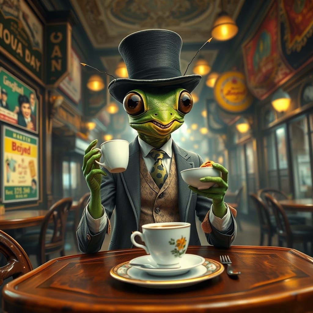 This image shows a dignified cricket enjoying tea and a sandwich in a vibrant Bombay cafe, surrounded by intricate details and warm golden lighting, reminiscent of a cinematic masterpiece
