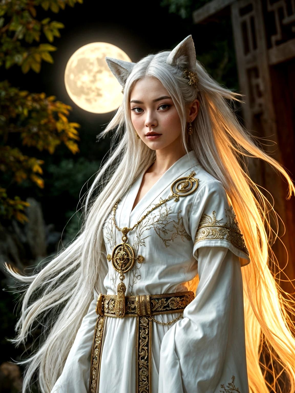 This image depicts a serene Asian woman with a stunning face, elegant demeanor, and long, flowing white hair, set against a mystical forest backdrop in a fantasy style, with intricate runes and accessories, capturing a sense of spirituality and wonder.