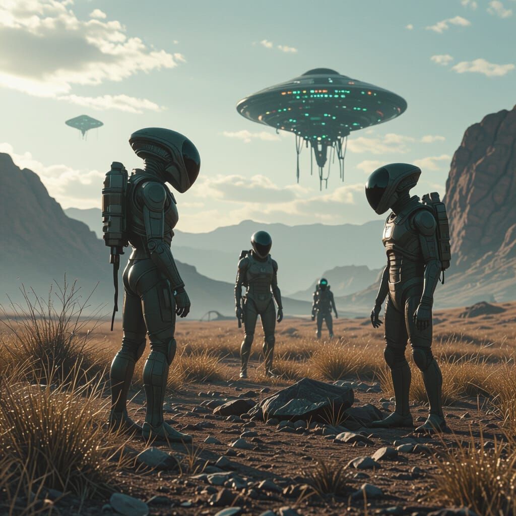 This image shows alien invaders in a post-apocalyptic landscape, searching for a powerful artifact. The scene features dramatic lighting, realistic textures, and a cinematic atmosphere reminiscent of live-action film.