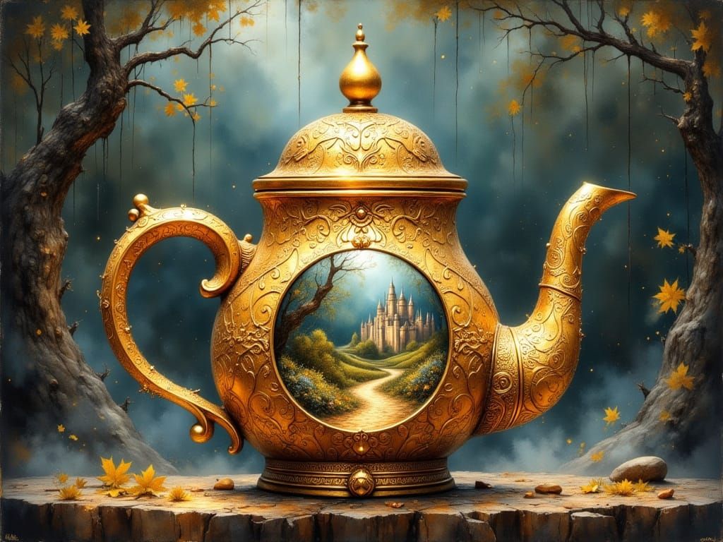 A striking picture of a golden teapot containing a miniature kingdom. The ornate teapot features a window revealing a castle and village inside, rendered in vibrant, detailed oil painting style with dramatic lighting.