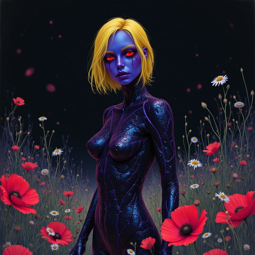 This image shows a striking android cyborg with spider-like features, standing in a field of flowers against a dark backdrop, with bold, vibrant colors and a haunting atmosphere reminiscent of dark fantasy art.