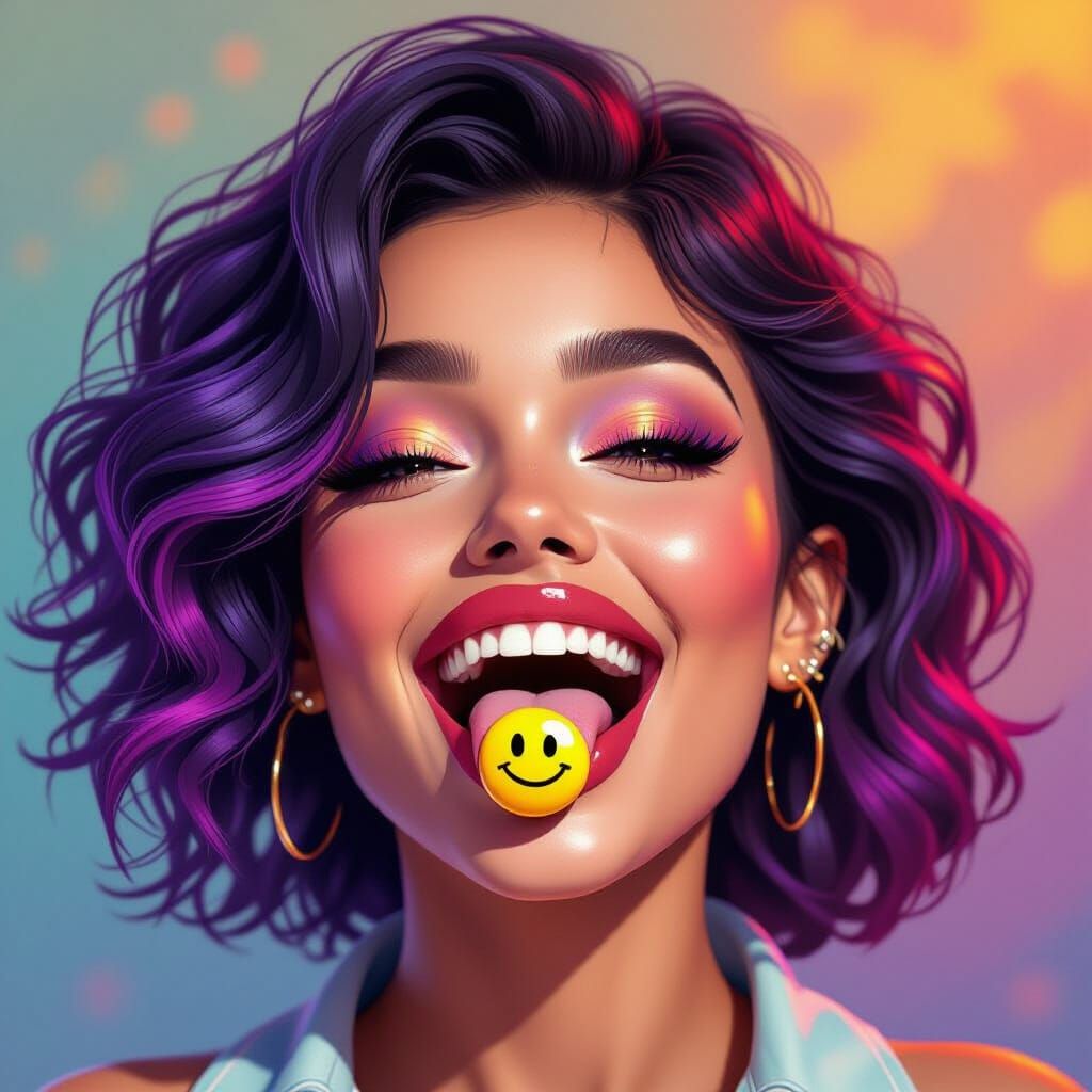 This hyperrealistic concept art features a detailed human face with wavy, colorful hair. A smiley face piercing adorns the tongue, set against a vivid splash art background with dramatic lighting.