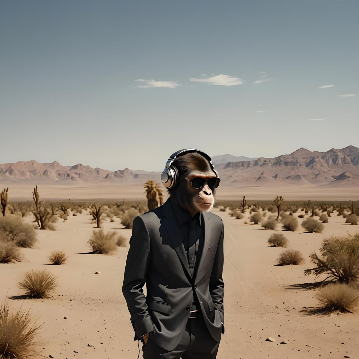 This image depicts a stylish monkey standing alone in a vast desert landscape, dressed in a dark business suit, sunglasses, and over-ear headphones, creating a striking juxtaposition of urban and natural elements.