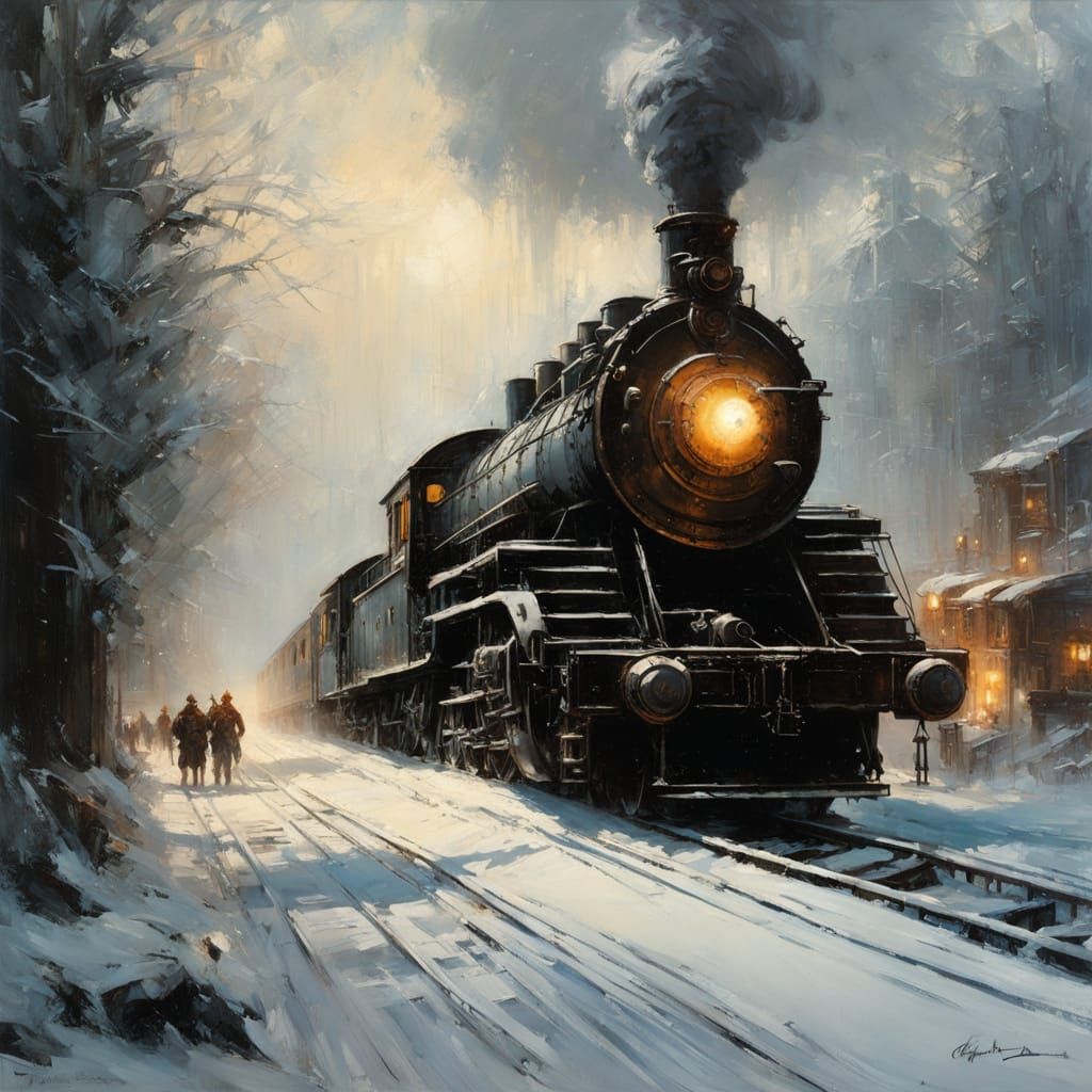 encaustic huge massive train frozen in ice, frostpunk, world of ice and snow, insanely detailed mixed media by jeremy Mann, 4K, hyperrealism, masterpiece, chiaroscuro, complex contrasts