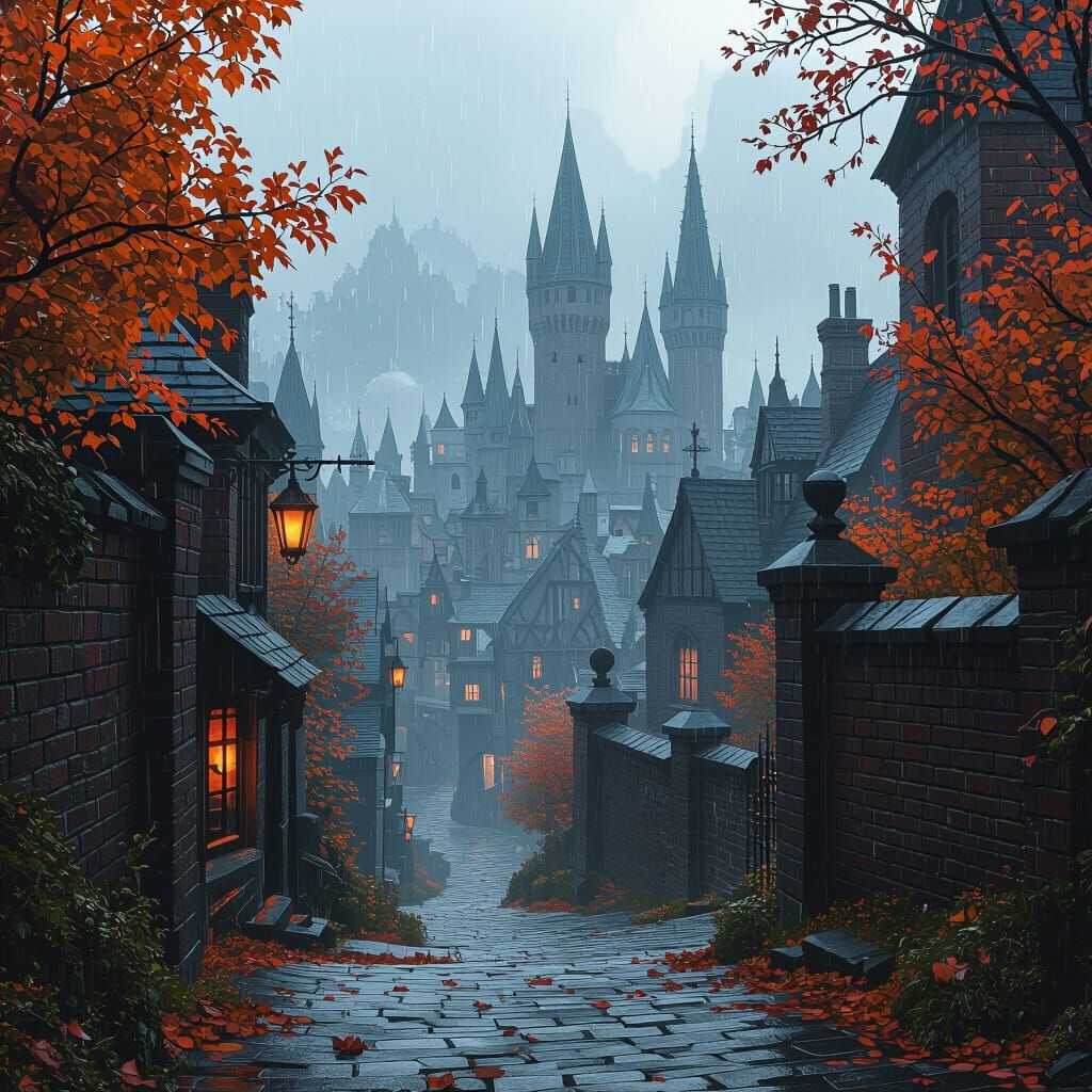 A dark fantasy city reminiscent of Skyrim, featuring cold, damp brick walls and vibrant autumn foliage. The image is set at midday with a light rain, rendered with a moody, atmospheric aesthetic.