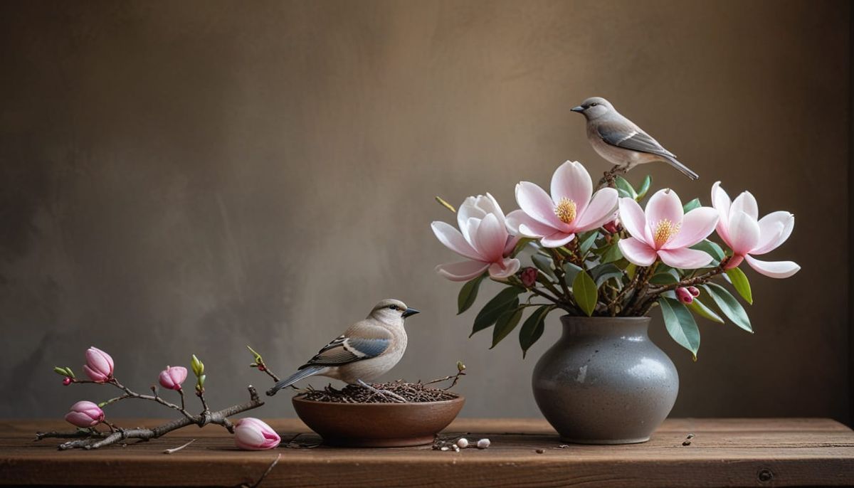 Uma composição de natureza morta com um vaso de cerâmica cheio de flores e galhos vibrantes de magnólia, com um pássaro fazendo ninho entre as flores...