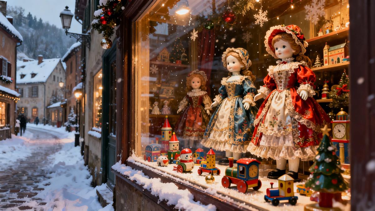 This hyperrealistic concept art captures a charming shop window in a snowy European village, featuring detailed porcelain dolls and tin toys. Warm interior light creates dramatic side lighting.