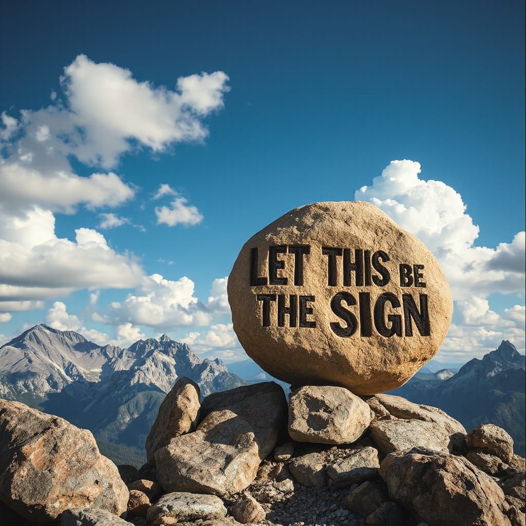 This image shows a weathered stone with an inscription in a stark mountain setting. The artwork evokes a dreamy, ethereal quality with dramatic lighting, reminiscent of 19th-century landscape paintings.