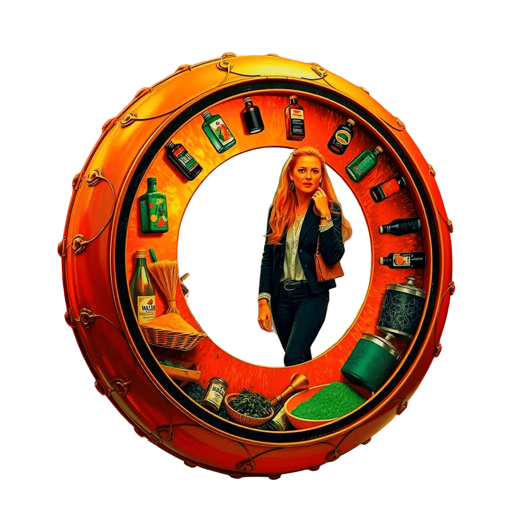 A hyperrealistic landscape painting of a confident woman in a vibrant spice market. Her ginger hair and handcrafted accessories stand out against the bustling scene filled with colorful spices and intriguing characters.