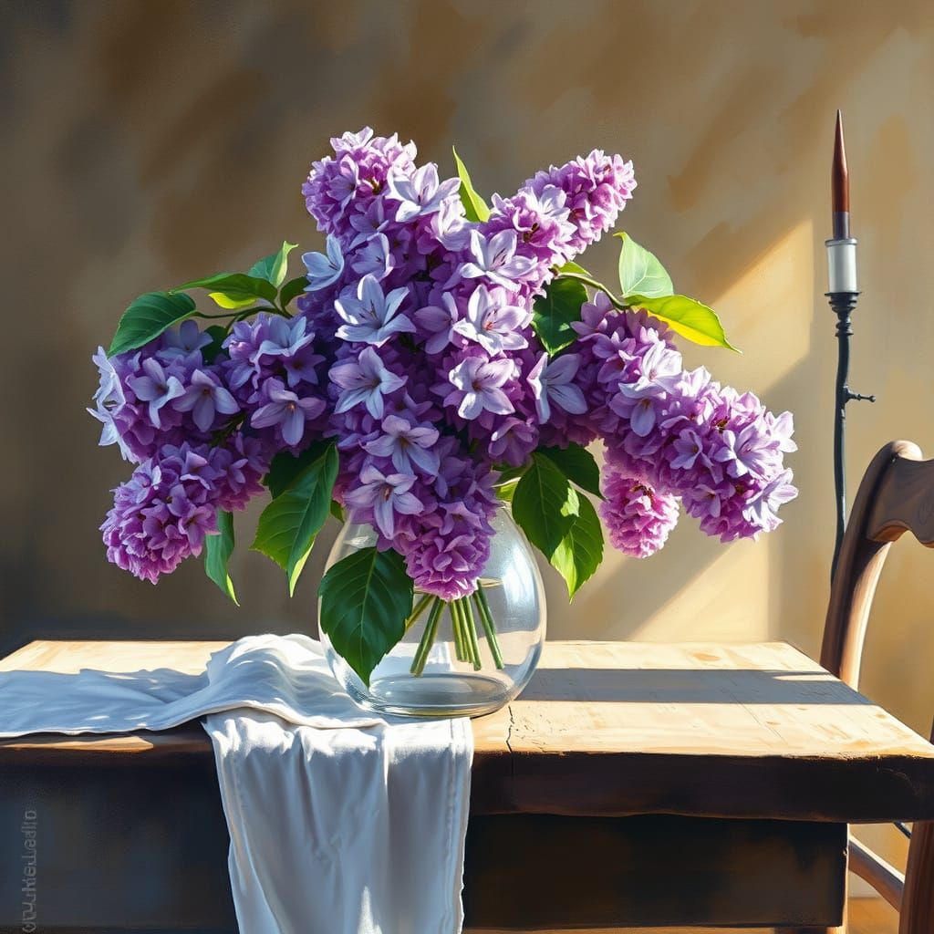 This vibrant painting captures a lilac bouquet on a rustic table, bathed in soft morning light, with intricate charcoal outlines and a blend of Gouache and Watercolor styles, reminiscent of Epic Impressionist masters with a Maximalist twist
