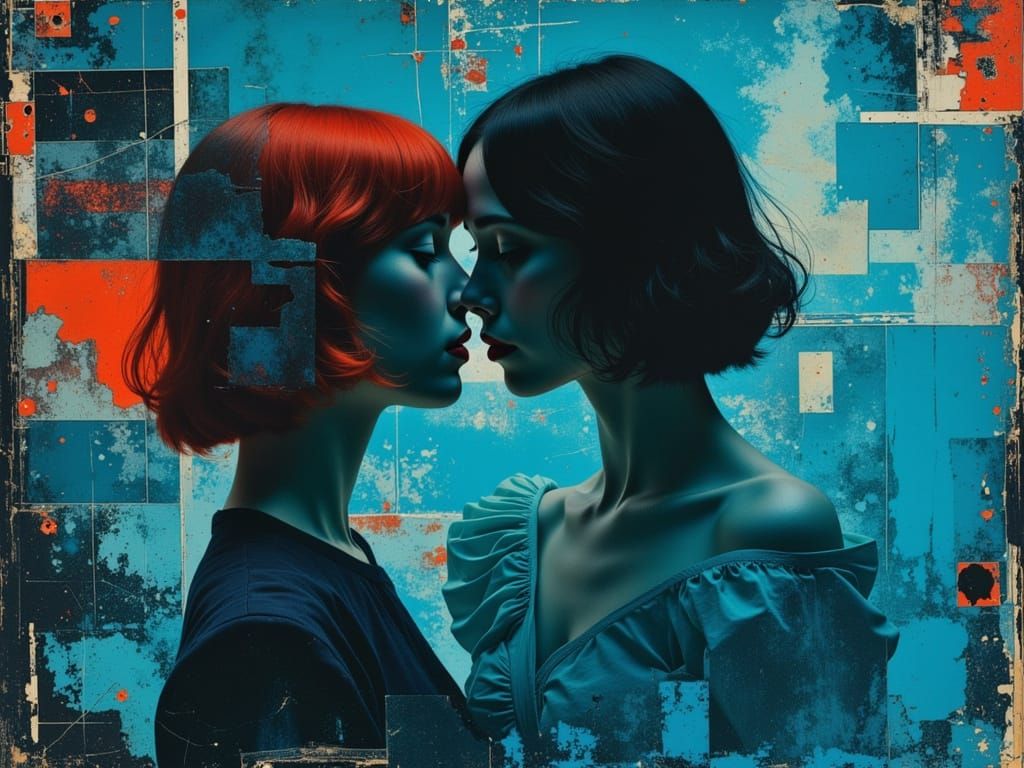 This image captures a poignant cyborg love scene with emotional intensity. It features layered double exposure art with a motel room silhouette and dramatic lighting, rendered in a surrealist style with expressive brushstrokes.