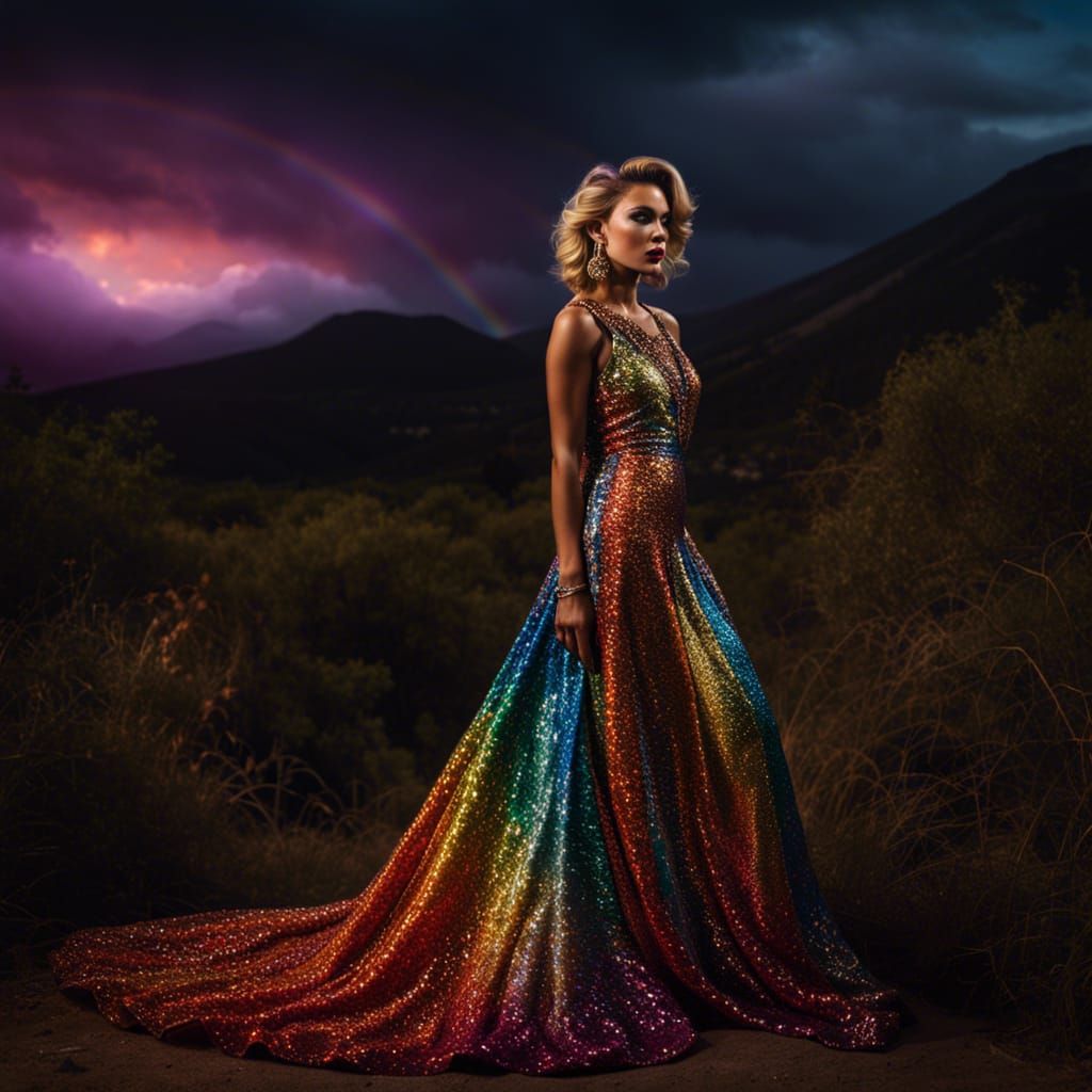 This image shows a woman in a glittering rainbow dress with leopard print. The hyperrealistic shot features intricate details, high contrast, and a cinematic, atmospheric mood.