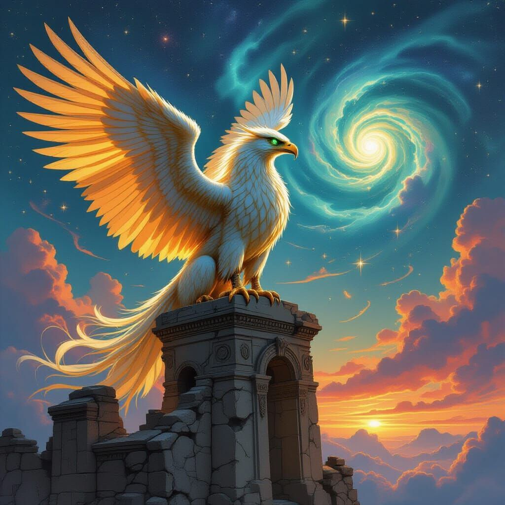 This image shows a majestic griffin with golden feathers and emerald eyes on an ancient observatory. It features detailed linework and dramatic lighting, evoking classical fantasy and Art Nouveau styles.