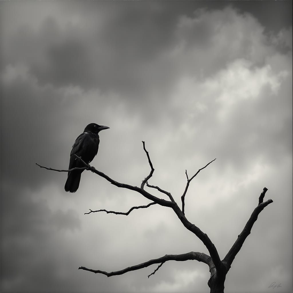 This image features a black crow with white chest feathers on a gnarled branch under a cloudy sky, depicted with high contrast light and shadow.