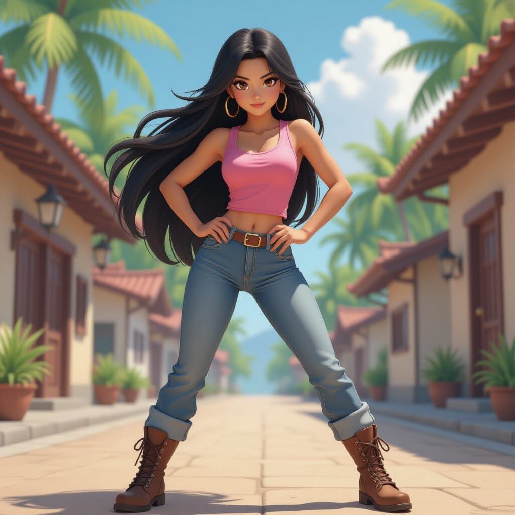 This image shows a tall, muscular tan-skinned teenage girl with long black hair, dressed in casual clothes and brown boots. The artwork blends anime aesthetics with 3D rendering techniques, reminiscent of digital art.