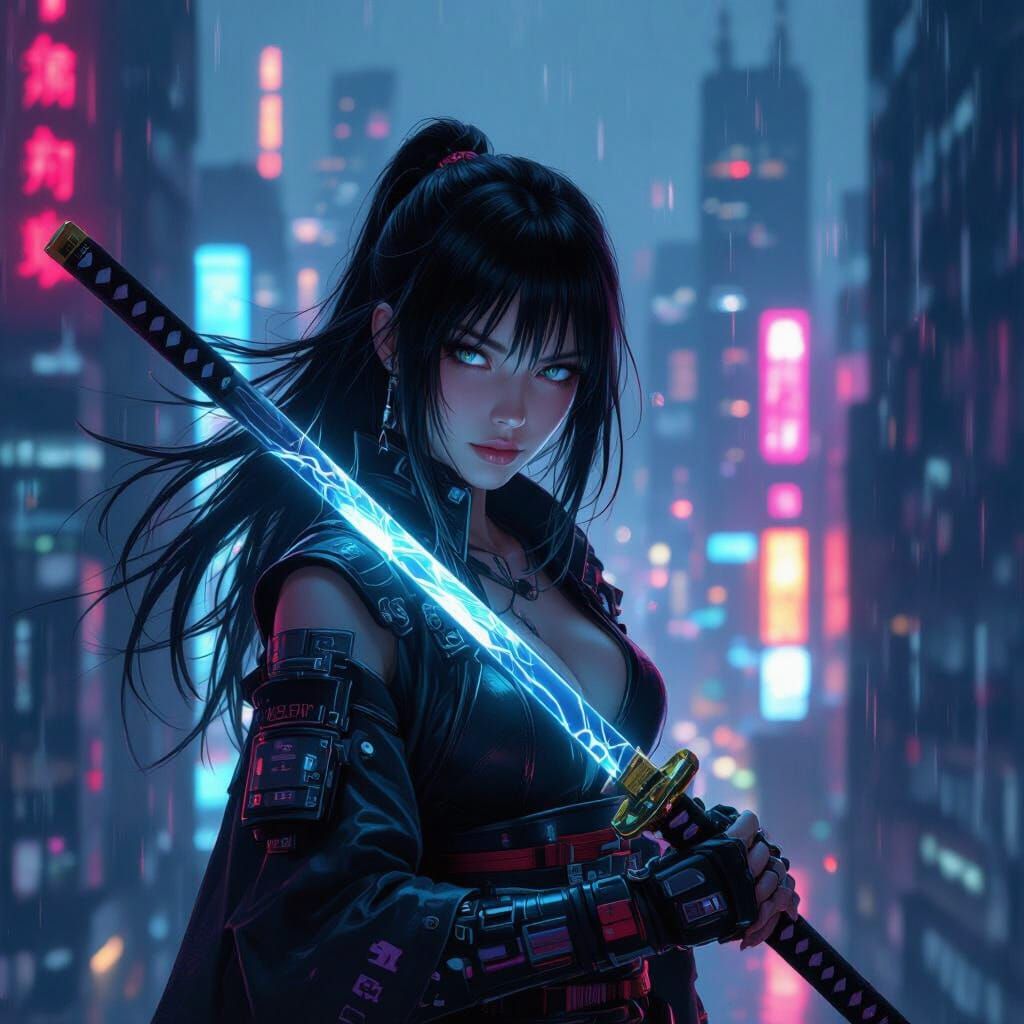 A striking picture of a woman with black hair and blue eyes in a futuristic samurai outfit, standing on a skyscraper in a cyberpunk city. The image features glowing katanas and a sci-fi aesthetic.