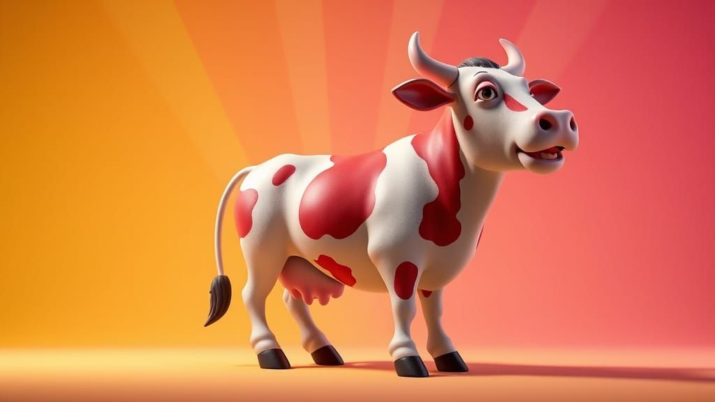 This image depicts a whimsical cash cow character design, presented as bright, colorful 3D digital art with a cinematic quality. The cow is set against a vivid radial gradient backdrop.
