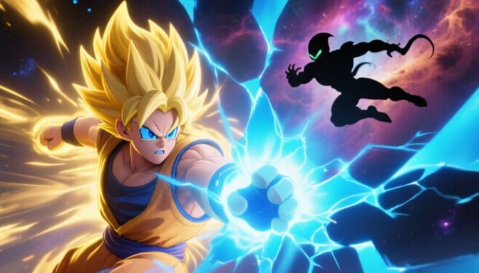 A powerful Super Saiyan Goku charges a massive energy blast while Frieza attacks. Features vibrant energy, dramatic lighting, and a nebula backdrop, rendered in a detailed 3D anime style.