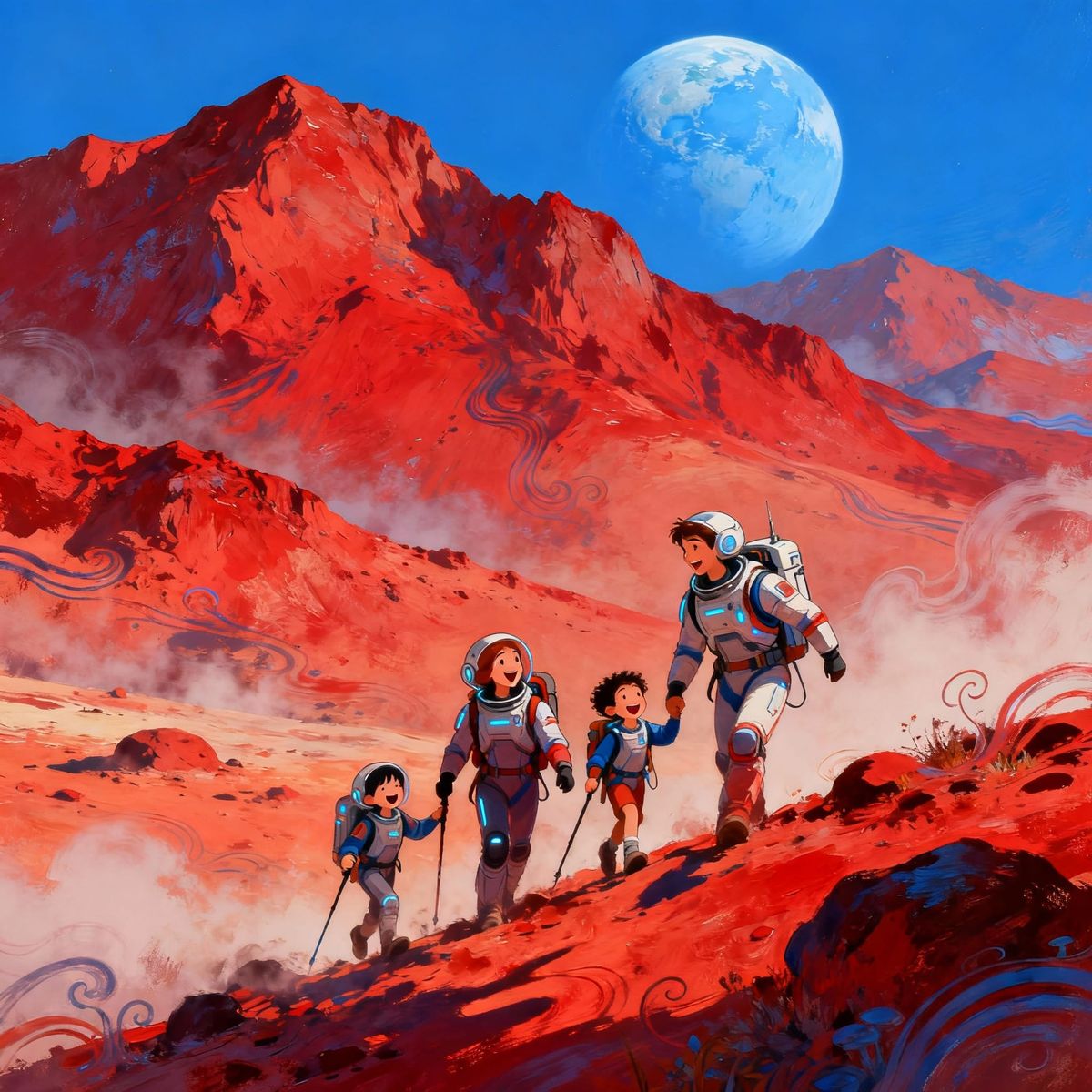 This image captures a surreal family hike on Mars, with red mountains and a distant Earth. Features flowing lines, painterly textures, and a dreamlike atmosphere.