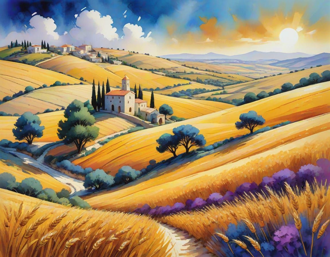 This stunning watercolor illustration captures a serene Israelite landscape from the river to the sea, with rolling hills of golden wheat and ancient stone architecture blending seamlessly into the scenery, set against a warm and gradient sky.