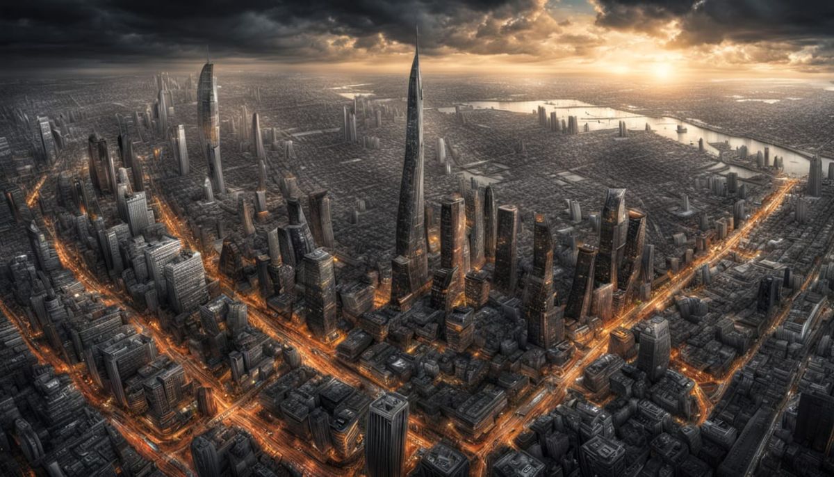 This image showcases a hyperrealistic, high-contrast fantasy cityscape drawn with a giant pen. It features intricate details, sharp focus, and an atmospheric, moody composition.