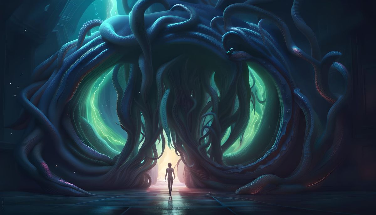 A digital illustration of alien tentacles emerging from a shimmering portal. The image features dynamic lighting and intricate details, creating a photorealistic, cinematic aesthetic.