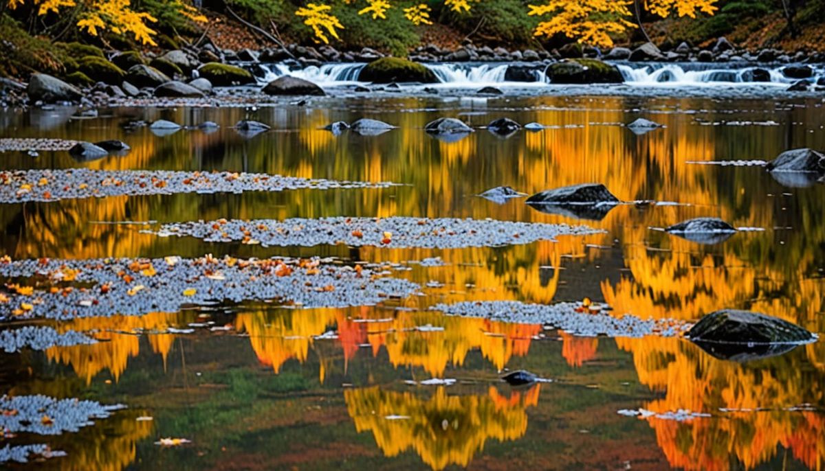 This image captures the vibrant dance of fall colors shimmering on the surface of fast-moving water. A beautiful natural scene.