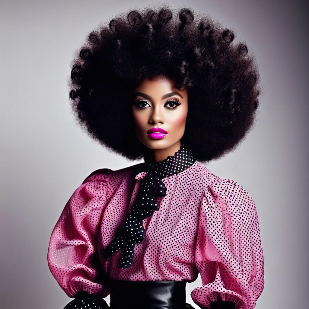 This image shows a high-fashion portrait of a woman with a large afro wearing a vibrant polka dot blouse. The close-up shot features soft lighting and a shallow depth of field.