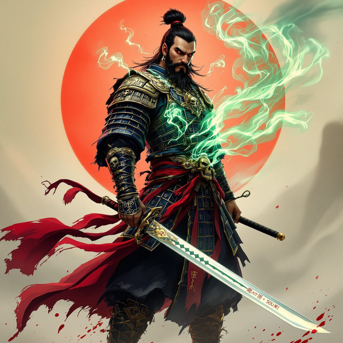 This image depicts a stern, middle-aged Asian warrior in battle-worn samurai armor, wielding a glowing ornate sword. Ethereal green smoke swirls around him, with a red sun disc behind. Fusion of ukiyo-e and graphic novel styles.