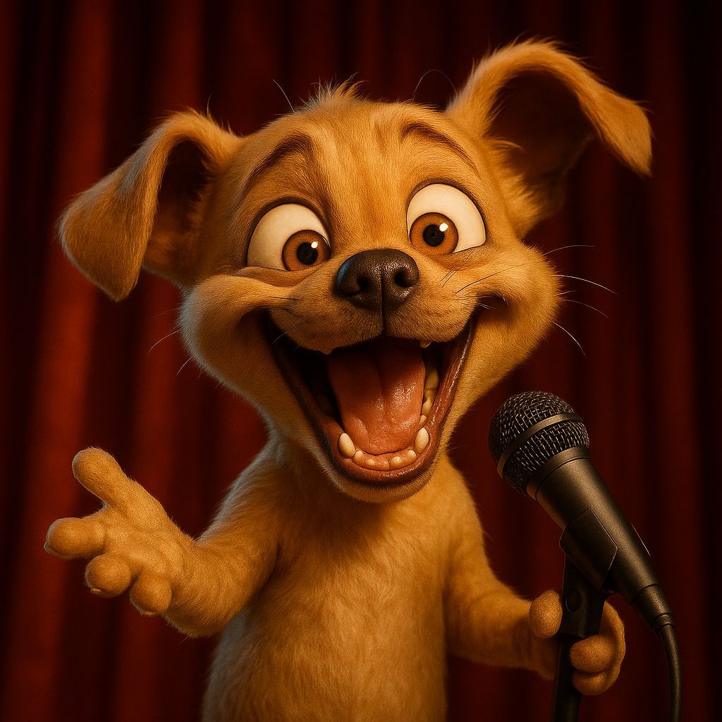 This image shows a CGI puppy comedian performing on stage. The character is highly detailed with exaggerated features and a sarcastic expression.