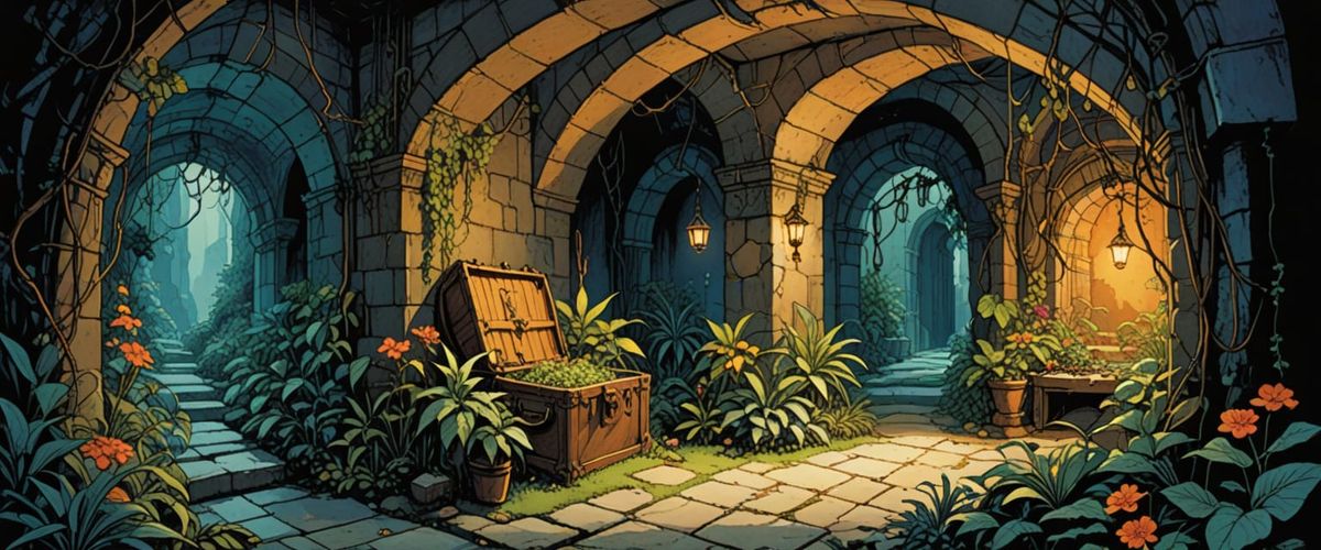 This image depicts goblins guarding a treasure chest in a mysterious, brightly lit dungeon passageway. The scene features polished stone, lush plants, and swords, rendered in a retro comic book style with watercolor and gouache textures.