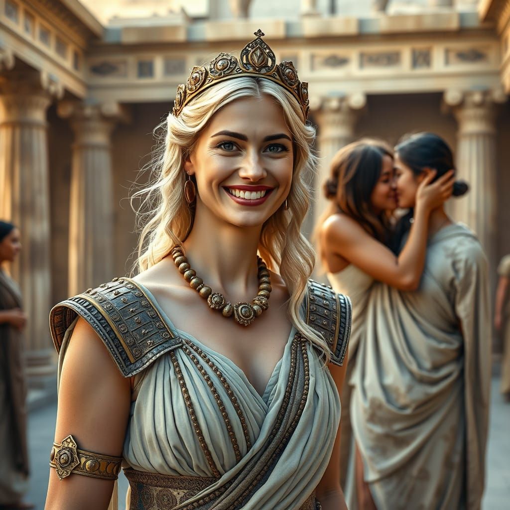 A photorealistic image shows a blonde woman dressed as a Greek queen in a detailed headpiece. Two Asian women are kissing in the background of the ancient Troy palace with cinematic lighting.
