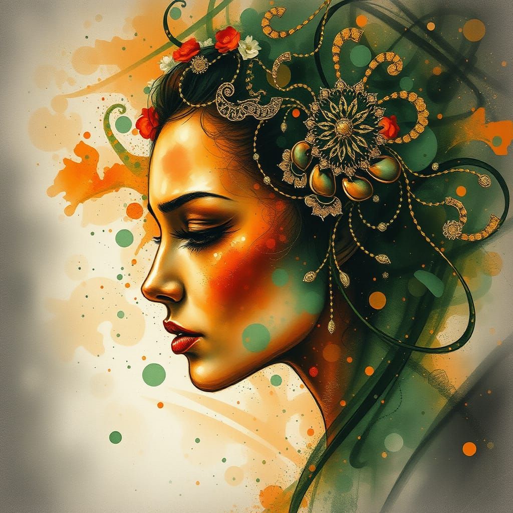 This image showcases a beautiful watercolor artwork featuring imperial orange and green hues, nuanced with gold accents, set against a background of intersecting blur splatters. The piece is characterized by chiaroscuro lighting and a moody atmosphere, with intricate details and textures reminiscent of f...