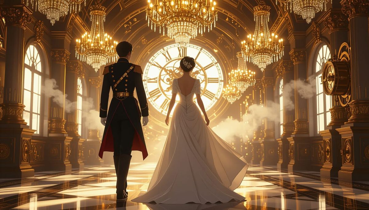 This image shows an androgynous figure in mixed attire within a grand clockwork ballroom, featuring golden steam and warm light, in a detailed anime-inspired concept art style.