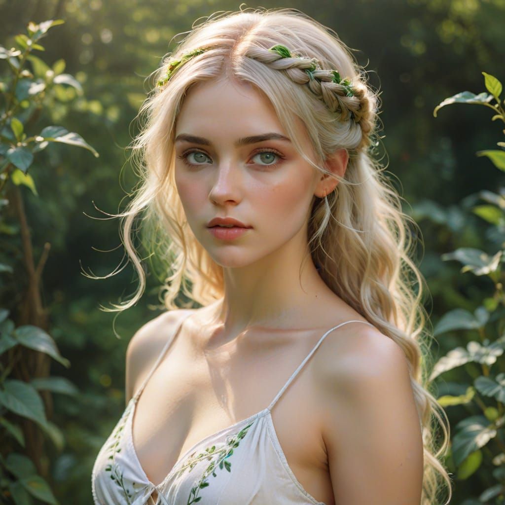 This beautiful watercolor portrait captures a captivating young woman in a serene setting, with vibrant white blonde hair and striking green eyes, surrounded by delicate braids and soft, natural waves, set against a dreamy, ethereal atmosphere.