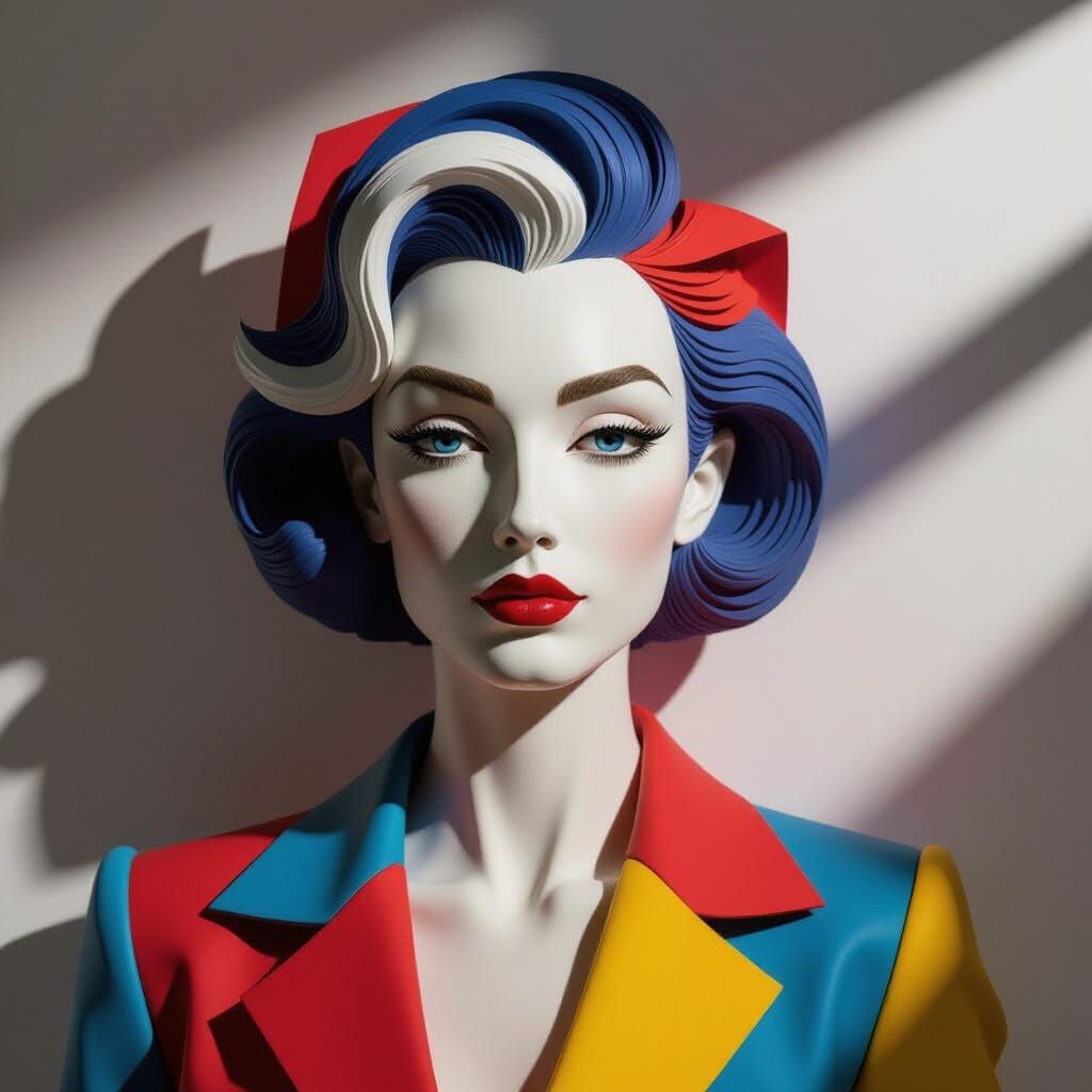 This striking avant-garde portrait showcases a unique mixed-media collage. A 3D porcelain face contrasts with flat, 2D paper hair and clothing, highlighted by dramatic chiaroscuro lighting.