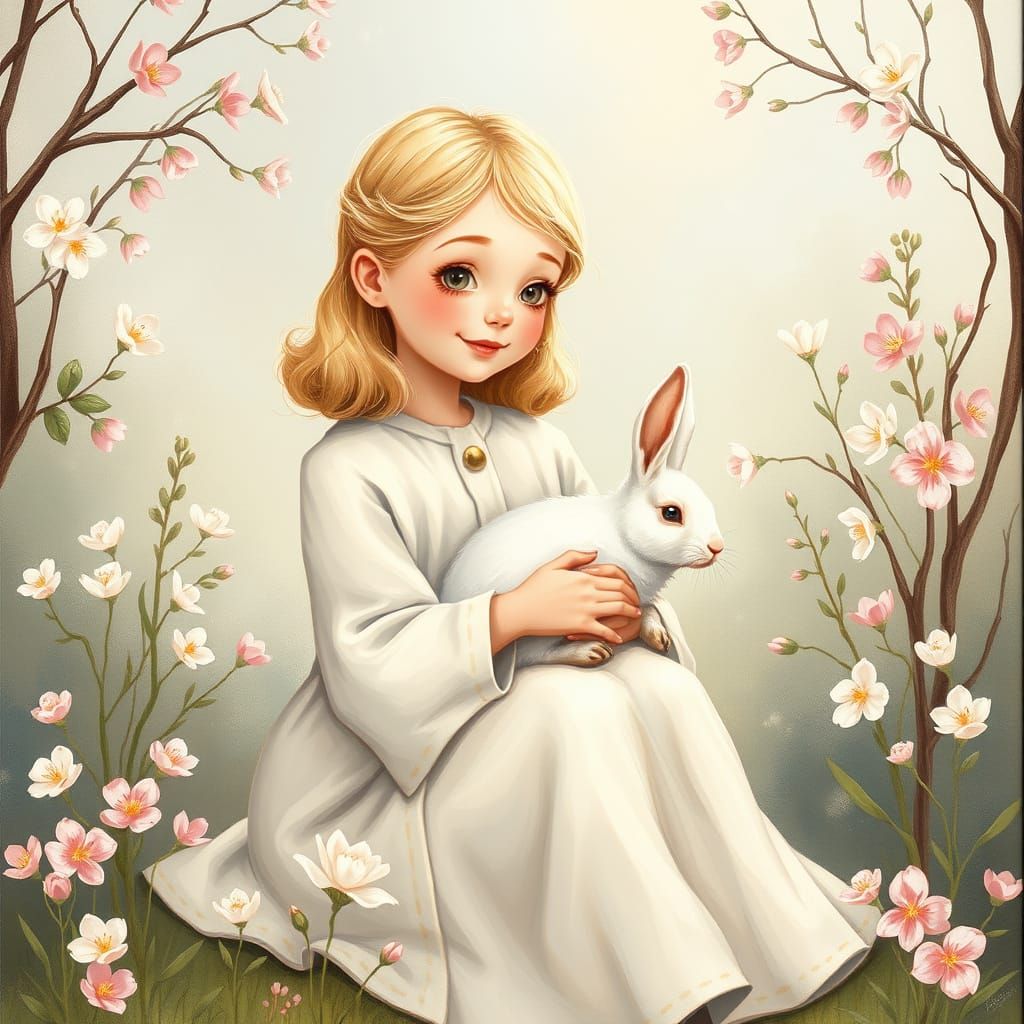 This image features a serene young girl surrounded by springtime colors and delicate flowers, holding a soft white Easter bunny in her arms. The scene is reminiscent of classic children's illustrations and Impressionist art, with a focus on gentle lighting and soft pastel hues.