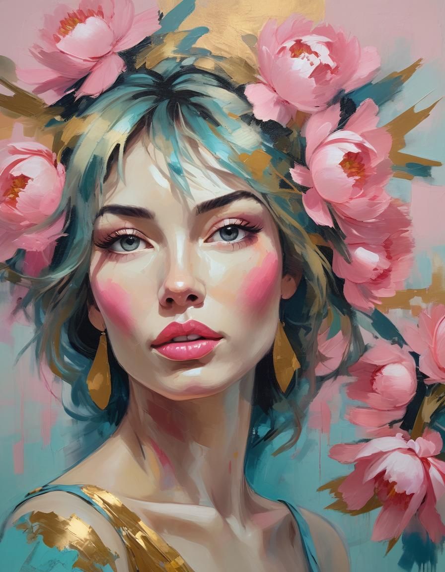 A vibrant oil painting of a woman with pink flowers in her hair, wearing blue and gold and holding peonies. The abstract fauvist expressionism style features bold brushstrokes and surreal floral patterns.
