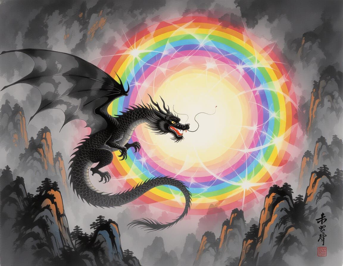 This image depicts a majestic obsidian dragon ensnared in a vibrant, shimmering quantum portal, rendered in the style of Chinese ink painting with subtle tonal gradations.