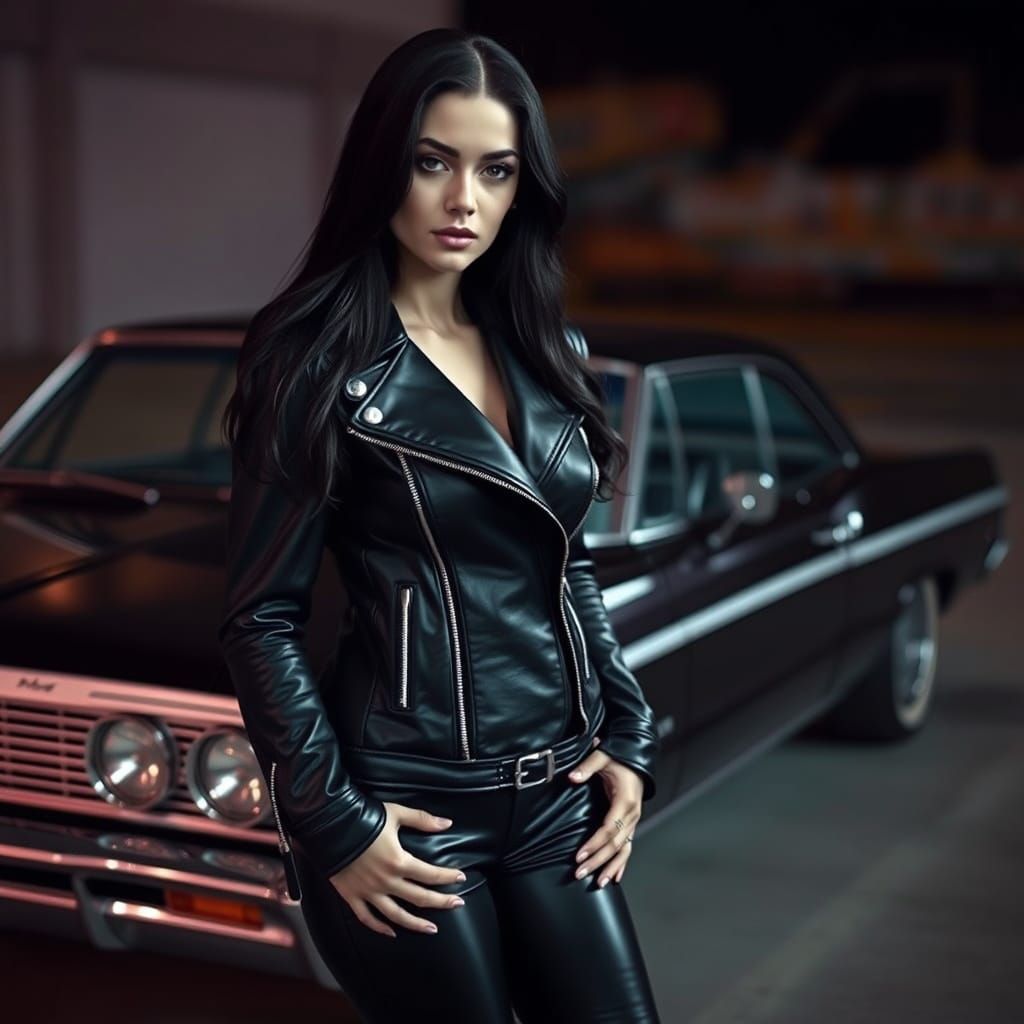 A striking picture of a woman with long dark hair in a leather jacket and pants, standing next to a classic Chevy Impala. The image has a cinematic aesthetic.