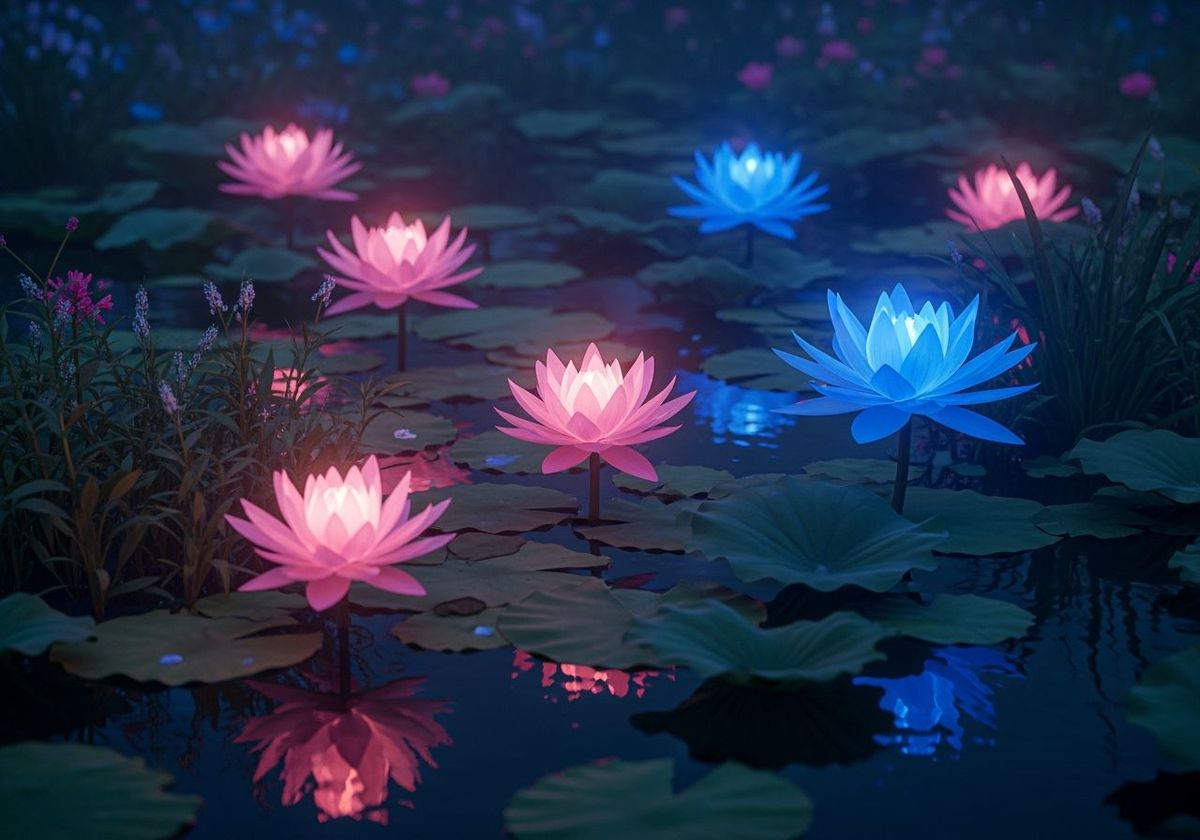 A serene image of a magical lotus pond at twilight. Bioluminescent lotus flowers emit a soft pink and blue glow, reflected in the water, as a surreal digital painting.