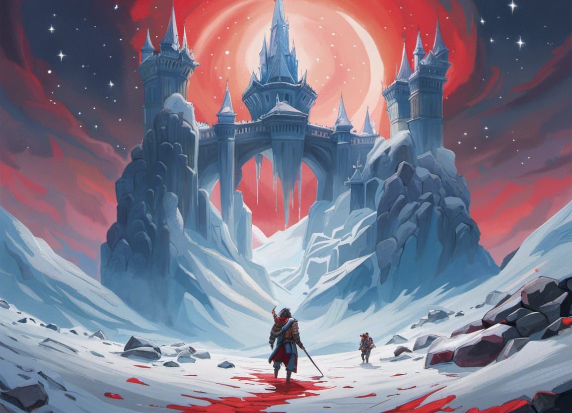 This image depicts a blue-skinned ice giant with white hair and red eyes, clad in furs and sporting a playful smile. The giant is set against a highly detailed anime-style backdrop featuring an ethereal ice castle in a snowy landscape.